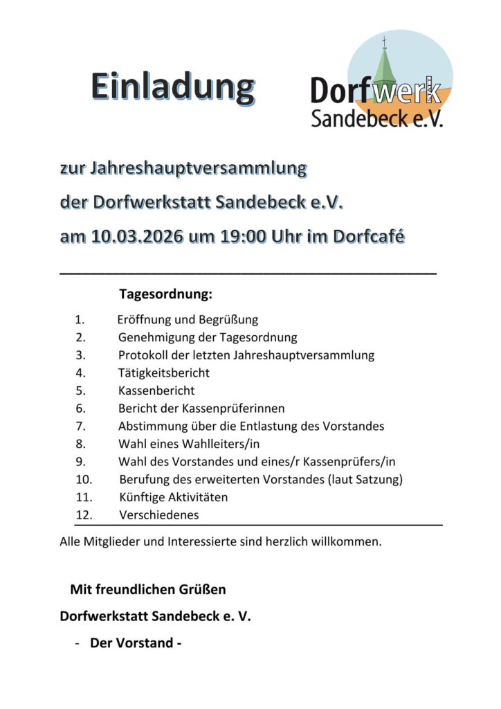 Die Dorfwerkstatt Sandebeck e.V. lädt alle Mitglieder und Interessierte ganz herzlich ein zur Jahreshauptversammlung am Dienstag, den 10.03.2026, um 19:00 Uhr im Dorfcafé.