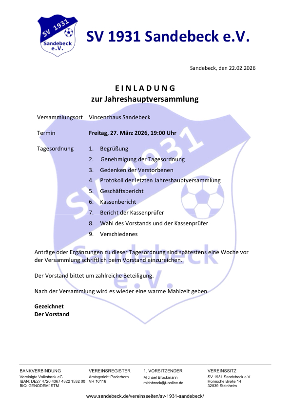 27.3.26 – 19 Uhr 🔵⚪️ Jahreshauptversammlung SV31 Sandebeck