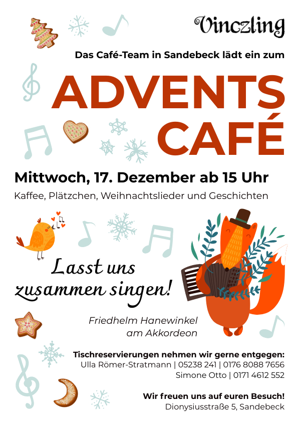 Am Mittwoch, dem 17. Dezember 2025, laden wir euch herzlich ein zum Adventscafé ab 15 Uhr mit Kaffee, Tee, Plätzchen, gemeinsamem Singen und weihnachtlichen Geschichten. Begleitet werden wir wieder von Friedhelm Hanewinkel am Akkordeon.