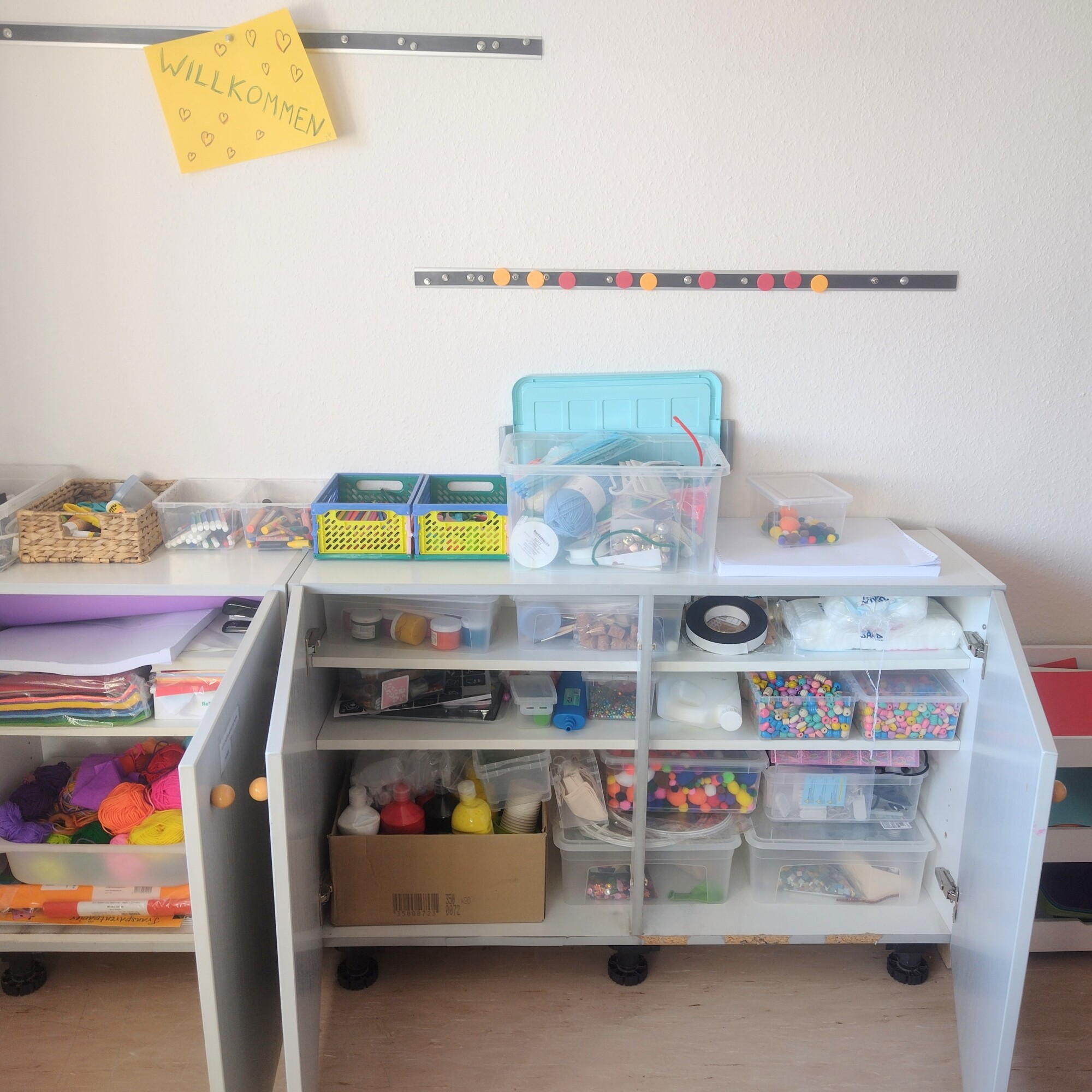 - 2 Stellwände (je eine beschreibbare und eine bepinnbare Seite), Beamer und Leinwand, Regale mit Stauraum